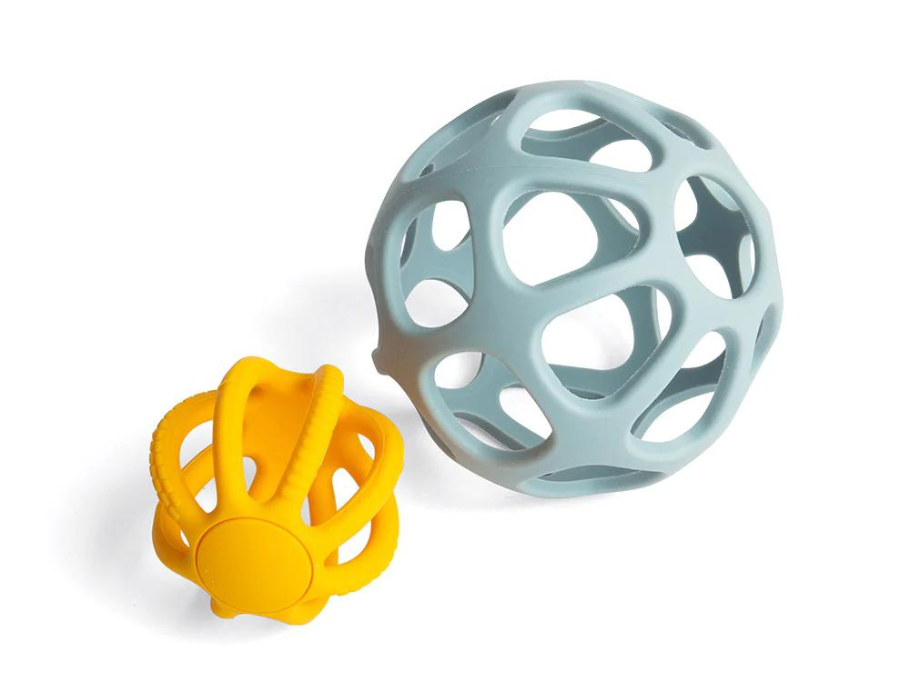 Dit bijtspeelgoed is perfect voor kinderen met doorkomende tandjes. De twee flexibele ballen zijn gemaakt van duurzame siliconen. Door de vorm van de ballen kunnen kinderen en baby's de ballen gemakkelijk vasthouden. Kinderen kunnen gooien en rollen met de ballen maar er ook in knijpen.