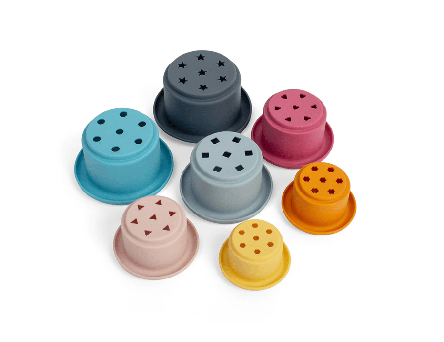 De 2-in-1 Silicone Stapelbekers bieden plezier in bad en daarbuiten. De kleurrijke set van zeven bekers met patronen op de bodem laat water als een waterval stromen. Naast badtijd zijn ze ook geschikt voor zintuiglijke zandactiviteiten op het strand of in de tuin, en ze zijn gemakkelijk schoon te maken. Dit stapelspeelgoed bevordert het leren van bouwen, nesten, balanceren en gieten, wat helpt bij de fijne motoriek en oog-handcoördinatie van kinderen. Gemaakt van 100% siliconen als een milieuvriendelijk alternatief voor plastic.